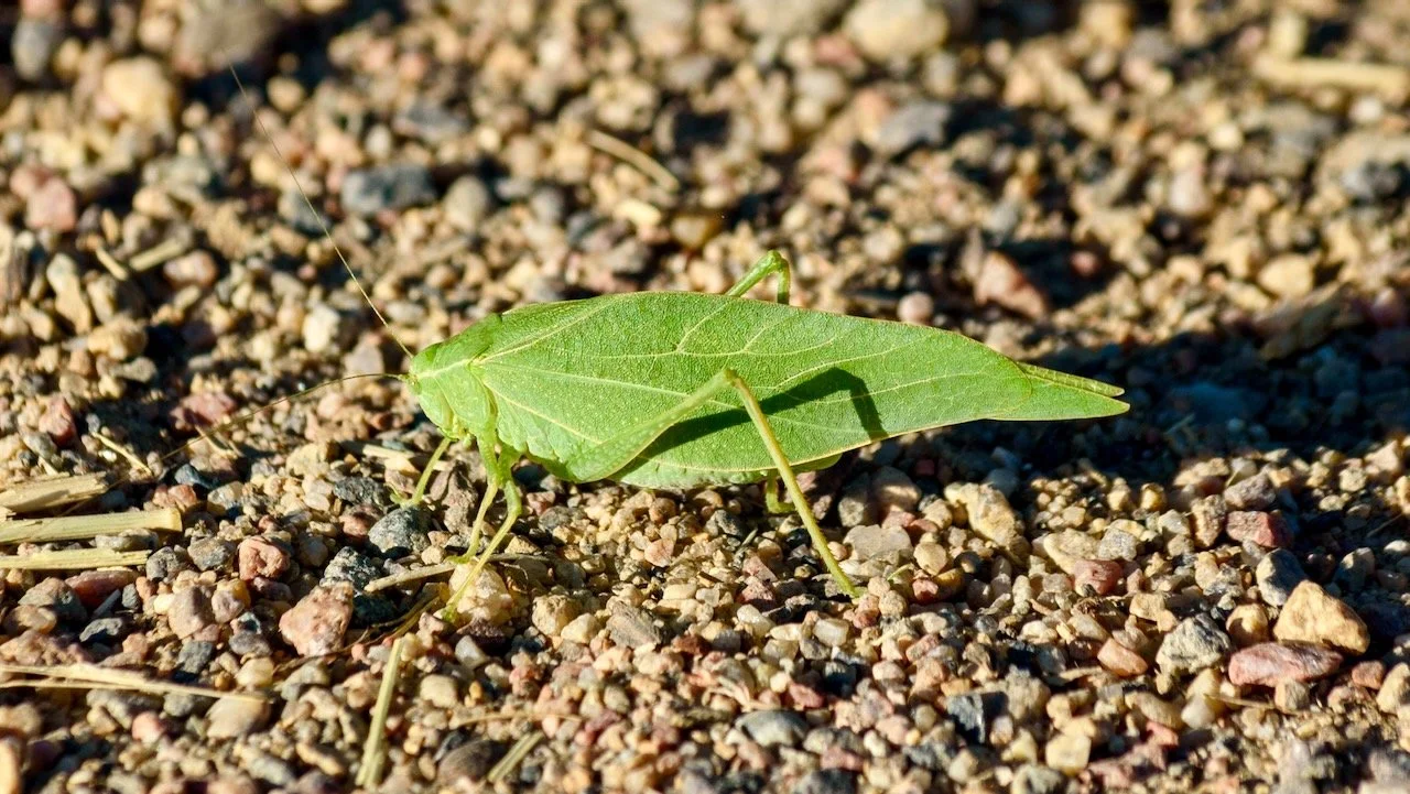 The internet says it’s a Greater Angle-Wing Katydid, Microcentrum rhombifolium. They make ticking sounds. Cool.
