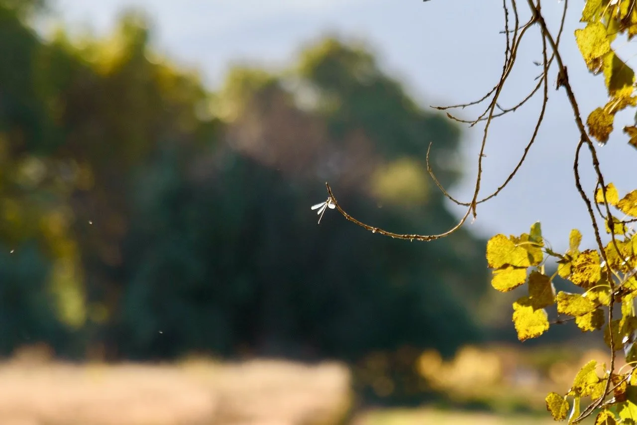 Not many birds. A spider or two. The aforementioned leaf-shaped bug. Leaves turning gold, leaping headlong into the wind to sail down from their lofty perch amid the airy cottonwood branches, while their still-green friends clung to the stems and sap, knowing that eventually, their turn would come.