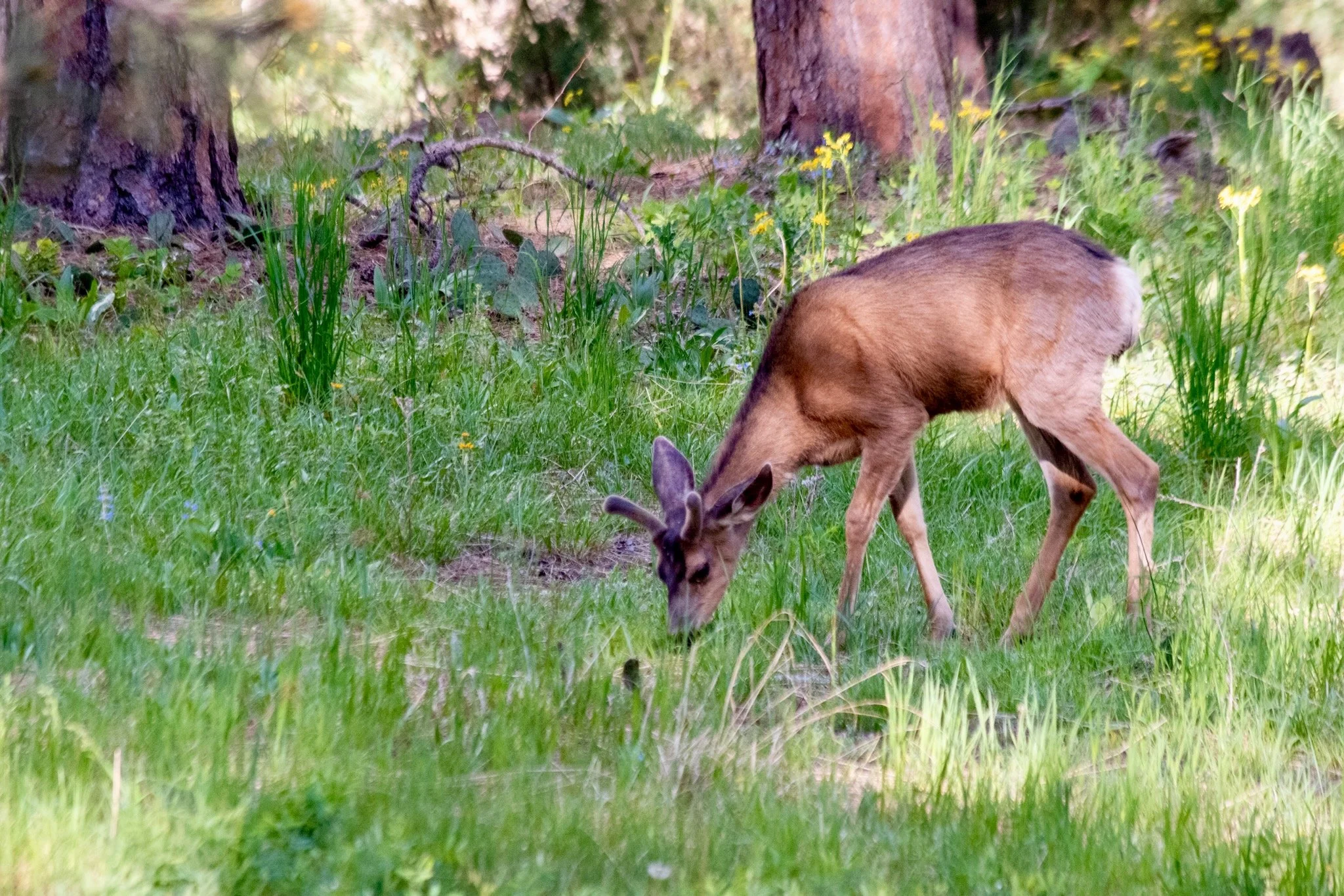 Plenty of flowers, a few hikers and joggers. All the cattle gates were closed and chained, and no cattle to be seen. A deer or two, with budding velvet antlers. S and D trudged upward, past the mid-point sign, and another half mile from there to the Mesa Trail. Huzzah!
