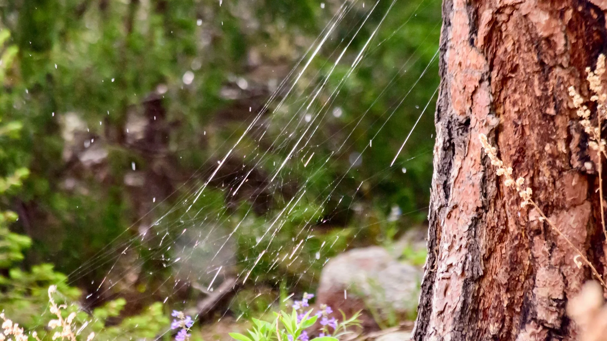 Cross the gully, and some rain happened. Light rain in sunshine. Drops bouncing off a large spiderweb. Just a spritz on the leaves, for photography’s sake.